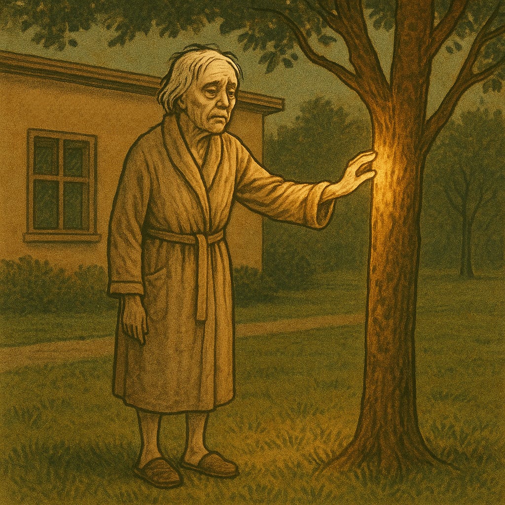 Alzheimer’s patient at Unit 4, The Shed. “Objay dart3”. Touches a tree that has light hitting it from the top of the hill.