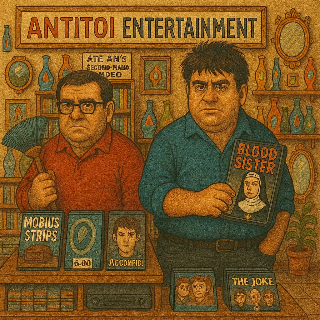 Both work at Antitoi Entertainment that sells cartridges and other bits and bobs. Lucien is responsible for inventory and order and struggles with French (and English) and has a broom. Bertraund is responsible for acquisition.